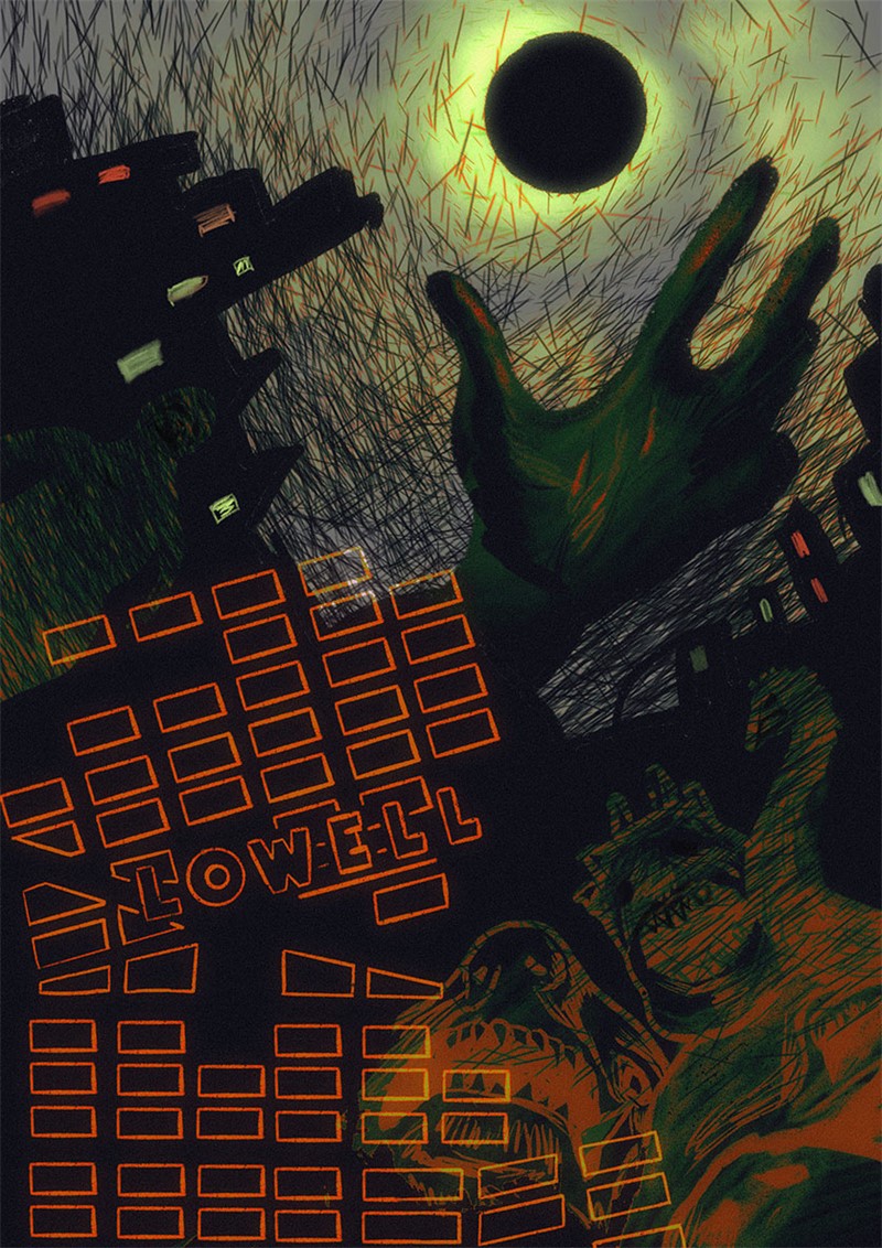 Синие вечера перед Рождеством, город в огнях, он виден почти целиком с поля за Текстильным после дневного воскресного шоу, время обеда, ожидание ростбифа или ragout d’boullette, незабвенное небо приподнято над сухим льдом зимних бликов, чистый воздух напоён синевой, грусть-тоска над переулками из красного кирпича и мраморными порталами Лоуэлльского Аудиториума, над сугробами красных улиц, всё ради печали, и полёт невероятных птиц лоуэлльского воскресного вечера к польской слободе за хлебными крошками – без понятия о Лоуэлле завтрашних дней, о Лоуэлле безумных ночей под тощими соснами с легкомысленно тикающей луной, распахнутый плащ, фонарь, земля раскопана, земля закопана, гномы, оси в жирной смазке в речной воде, и луна сверкает крысиным глазом – это Лоуэлл, это Мир, как он есть.