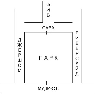Вскоре после этого Г. Дж. переехал на другую сторону улицы, со скорбной мебелью из греческих трущоб на Маркет-стрит, где в воскресный день слышны вопли восточных греческих пластинок и стоит запах мёда и миндаля. «Призрак Запа в этом чёртовом парке», – сказал Г. Дж., и он никогда не ходил через него домой, но обходил его по Риверсайд и Сара или по Джершом и Сара, а Фиб (где он жил все эти годы) лежит между этих двух зубцов.