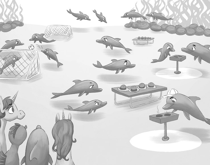 Эхо, Вспышка, Руби и я приплыли в парк Рыбы-фугу. Здесь повсюду сновали десятки дельфинят: одни играли в хвостобол – старались забить мяч хвостом в ворота соперников, другие готовили бутерброды с мидиями.