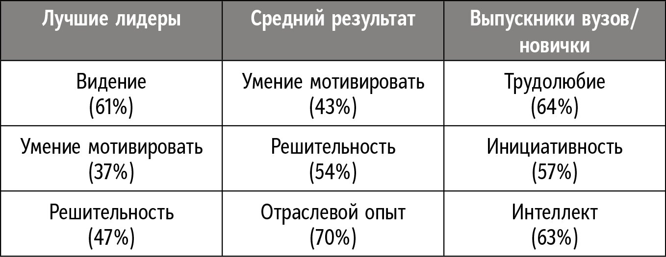 Взгляните на табл. 2. Она опирается на исследование, в ходе которого респондентам задали вопросы: «Какими качествами должны обладать лидеры?» и «Довольны ли они своими лидерами?» Здесь перечислены пять основных требований к хорошему лидеру на каждом уровне организации (процент удовлетворенности указан в скобках).