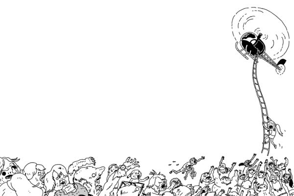 Все навалились на консоль, уставившись в мониторы. Угольно-черный вертолет завис над переполненной зомбарями посадочной площадкой. Из него свесилась веревочная лестница, которая теперь болталась в метре с небольшим от земли. Вскарабкавшись на самый верх, Мэдисон озиралась, надеясь высмотреть пропавшего щенка, но двое мужчин в темных костюмах и очках втащили ее внутрь. Вертолет взмыл в темное небо, усеянное звездами.