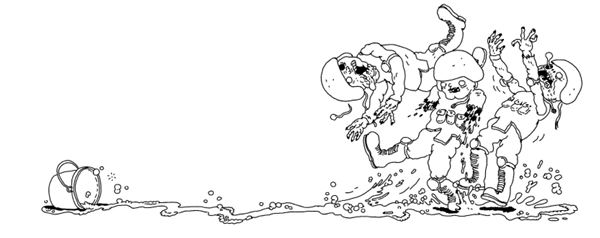 Ведро перевернулось, и мыльная жижа выплеснулась под ноги гурьбе зомбарей. Вожаки уродливого выводка ступили в лужу и тотчас покатились по скользкому линолеуму, как конькобежцы-новички. Они цеплялись за стены в попытке выровняться, но соскальзывали и падали.