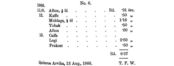 Просто для примера приведу счет из отеля. Риксдалер содержит 100 эре и стоит около 14 пенсов, так что вся сумма меньше 8 шиллингов.