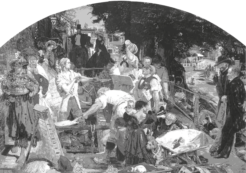 Английские города представляли собой нагромождение чудовищно загрязненных, перенаселенных, малопригодных для жизни трущоб, разительно контрастировавших с блестящими аристократическими кварталами с их мощеными улицами, элегантной архитектурой и живописными садами[6]. Как писал историк Джордж Маколей Тревельян (1876–1962), родившийся в поздневикторианской Англии, «беднота, пожалуй, всегда была столь же бедна и подвергалась такому же скверному обращению, но ее тяжелое положение стало более очевидным и для нее самой и для других именно теперь, когда она была обособлена и собрана вместе».