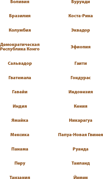 Кофе – это живучий кустарник, который выдерживает самые различные природные условия и прекрасно себя чувствует даже в качестве комнатного растения. Но плантации самого изысканного кофе располагаются вблизи экватора, в зоне от тропика Козерога[2] до тропика Рака[3]. Тропический климат и возвышенности – это идеальные условия для культивирования элитного кофе. Есть и другие места, где произрастают сорта более низкого качества, но кофе, собранный в Восточной Африке, Северной и Южной Америке и в Азиатско-Тихоокеанском регионе, является самым высококлассным. Именно его подают в элитных кофейнях.