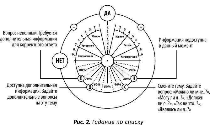 Помните: вопросы должны быть краткими и конкретными. Если вы гадаете по пальцам, спросите: «Является ли (название кристалла) лучшим и наиболее подходящим кристаллом для лечения моей головной боли в данный момент?» Если вы гадаете с помощью маятника, попросите: «Пожалуйста, покажи мне лучший и наиболее подходящий кристалл для лечения моей головной боли сейчас». Также можете воспользоваться рисунком 2 «Гадание по списку» и задать вопрос: «Существует ли более глубокое болезненное состояние, лежащее в основе моего симптома?» Если ответ «да», спросите: «Находится ли это болезненное состояние на физическом (подождите мгновение, пока маятник отреагирует), эмоциональном (подождите мгновение), ментальном (подождите мгновение) или душевном (подождите мгновение) уровне?» Затем вы можете воспользоваться справочником и по очереди провести пальцем по каждой букве алфавита. Когда вы получите ответ «да» от маятника, ведите пальцем вниз по странице, пока маятник не обнаружит глубинную причину вашей болезни. Как работать с маятником, смотрите в разделе «Гадание с помощью маятника».