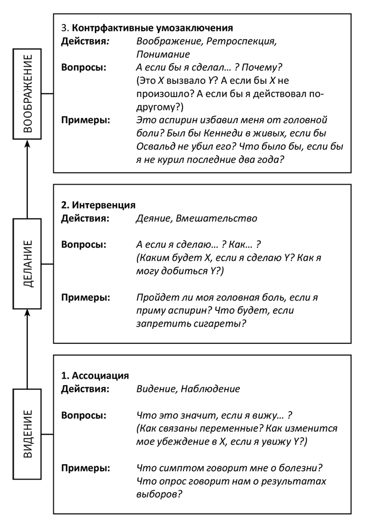 Возможно, к этому моменту я создал впечатление, что способность организовывать знания, деля их на причины и следствия, едина и мы приобрели ее сразу. На самом деле, исследуя машинное обучение, я узнал, что для изучения причинно-следственных связей необходимо овладеть когнитивными навыками по крайней мере на трех конкретных уровнях – видения, делания и воображения.