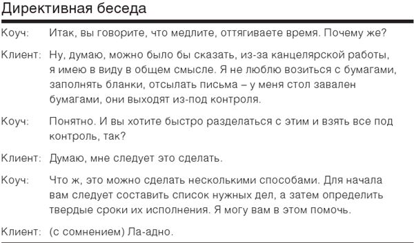 Вы заметили, что в вышеприведенном диалоге говорит в основном коуч, который явно контролирует ход беседы. От него же исходят идеи и решения, которым и должен следовать клиент.