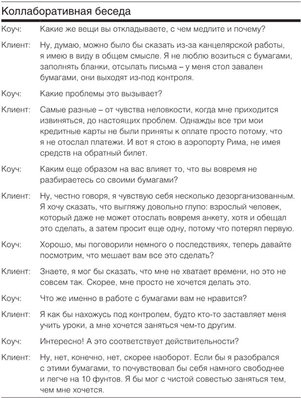 Коллаборативный стиль предполагает, что у человека зачастую есть свои собственные ответы, и ему лишь нужна помощь на пути к решению. Например, человек, который постоянно откладывает важные задания, обычно хорошо знает и себя, и свои способности к совершенствованию. Коллаборативный коуч сосредоточит внимание клиента на соответствующем моменте проблемной ситуации, чтобы побудить его высказать свои мнение и идеи, необходимые для достижения прогресса. Это может выглядеть таким образом.