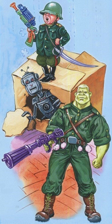 “To conquer all indiscriminately, blockhead! First, we’ll take over this room and these dollhouses will be ours. We’ll build a base here and then attack the ice-cream kiosk. Kids love ice cream very much. We’ll force them to throw away all the toys. Instead of old toys, different kinds of teddy bears, dolls, and bunnies, let them buy pistols and Tommy guns!”
