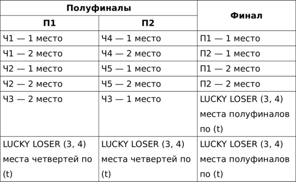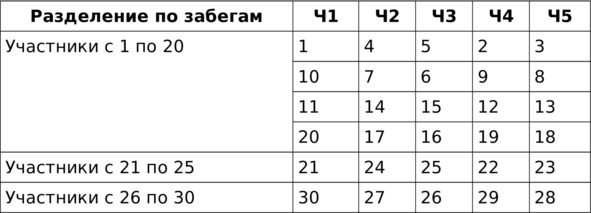 Еще одна форма гонок – это индивидуальный спринт, где есть возможность пробежать четыре раза. Сначала идет квалификация, она проводится на дистанции от 800 до 1800 м путем раздельного старта через 15 сек. После этого формируется протокол результатов, первые 30 человек, показавшие лучшее время, проходят в четвертьфинал, а для людей, не попавших в заветную тридцатку, гонка на этом заканчивается. Далее формируется пять четвертьфиналов по шесть человек в каждом (сетка представлена ниже). В полуфиналы проходят по два человека из каждой четверти с лучшим временем, а после этого из всех пяти четвертьфиналов отбирают еще двух спортсменов, которые показали достойный результат, заняв третью и четвертую строчки. В итоге формируются еще два полуфинала, из которых в финал попадают шесть человек по той же схеме. Победителем становится спортсмен, который первым закончил соревнование.