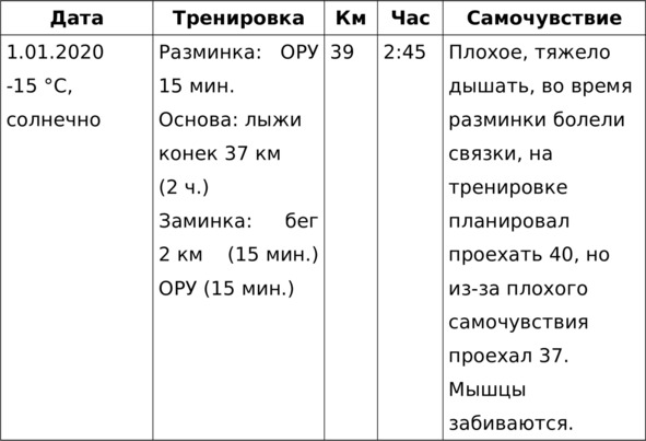 В колонке под названием «тренировка» вы максимально подробно расписываете свою тренировку, начиная от разминки и до самого последнего упражнения. Для примера я взял одну из своих зимних тренировок.