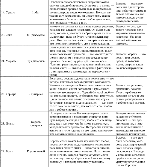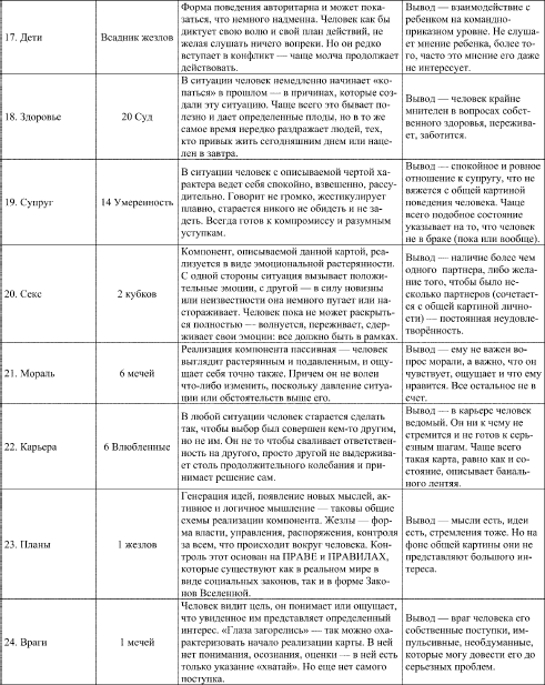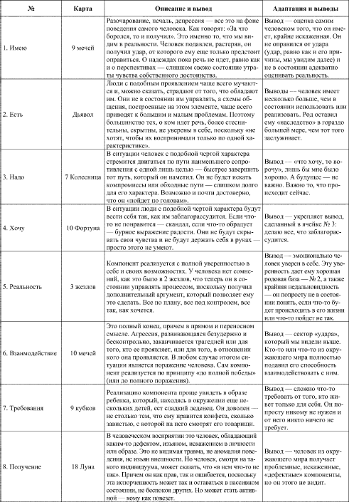 Как вы можете видеть, расклад получился довольно емкий и содержательный. Главное, он образует общую целостность: вы видите описание человека, и у вас не возникает вопроса, а почему он себя так ведет? Это видно в раскладе – он такой, со всеми достоинствами и недостатками и со своей манерой взаимодействия с окружающим миром.