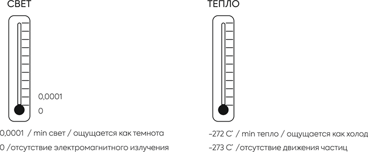 Понятно, что для нас тепло и холод – это не физические явления, а всего лишь ощущения. Каждый сам решает, когда ему становится холодно. В Таиланде при +20 уже прохладно, а в Якутии –15 – это жара. То же самое и со светом. Свет – это электромагнитное излучение. Когда количество излучения снижается, то в определенный момент мы начинаем видеть темноту. Но электромагнитное излучение не исчезает совсем, оно там есть. Только вот глаз человека уже не способен воспринимать его.