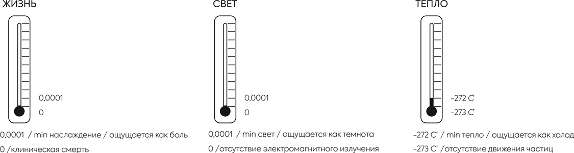Возьмем такое физическое явление, как движение частиц. При увеличении скорости движения возникает больше тепла. При снижении – уровень тепла снижается. Температура бывает плюсовая и минусовая. А еще на термометре есть нулевое значение. Если плюсовая температура – это тепло, а минусовая – это холод, то как мы должны себя чувствовать при нуле градусов? Никак? Но если за окном нулевая температура и вы спросите вошедшего с улицы: «Ну что там за окном, какая погода?» «Холодно», – ответят вам.