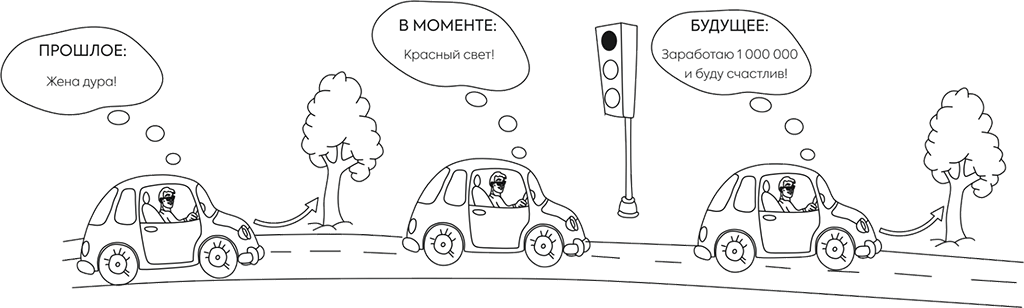 Получается, что физическая боль отключает психическую? Да. Но для человека, который не замечает своих мыслей и чувств в моменте, все это проходит автоматически. Белое пятно. Только боль способна вернуть в реальность. Быть здесь и сейчас – это значит ехать за рулем и думать про дорогу, а не прокручивать в уме снова и снова то, что было три часа назад.