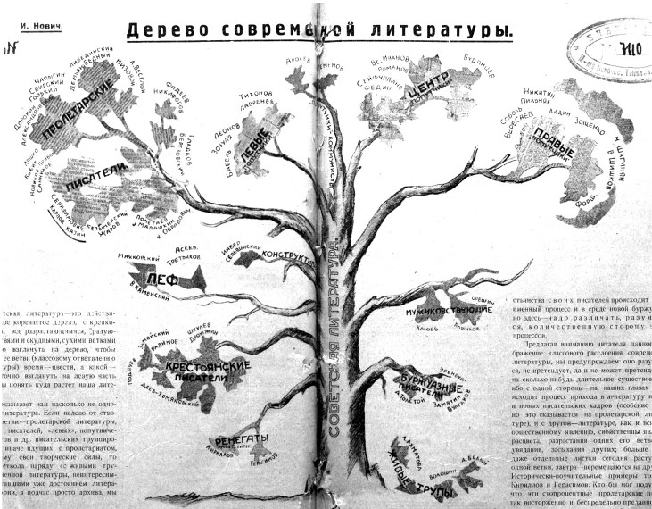 Илл. 2. И. С. Нович. Дерево современной литературы. Рисунок опубликован в журнале «На литературном посту» (1926. № 3. С. 24–25)