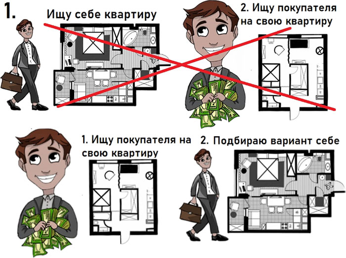 В этом случае у нас уже «есть» деньги и мы можем смело отправляться за покупками. Выбираем квартиру и также фиксируем ее за собой, внеся предоплату. Готовим деньги и документы и выходим на две сделки: продажа и покупка в один день в одну минуту – именно это условие обозначает обмен. Мы продаем одному человеку, а покупаем у другого, но происходит это одномоментно. Такой обмен – самый безопасный.