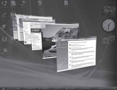 При включенном стиле Windows Aero для перехода между окнами можно использовать сочетание клавиш Windows+Tab, с помощью которого реализуется эффект трехмерного пролистывания открытых окон (рис. 2.1). В англоязычной документации этот эффект называется Flip 3D, а в справочной системе к русской версии – эргономичное пролистывание.