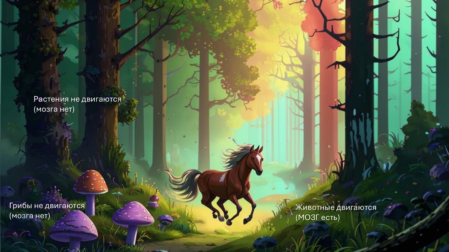 Мозг предназначен для управления движением организма, то есть его действиями. А также для управления другими органами и системами организма. На нашей планете есть три царства крупных организмов. Это растения, грибы и животные. Растения и грибы не двигаются, поэтому мозга у них нет. А вот животные – это движущиеся организмы, и мозг у них есть.