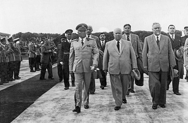 Советская делегация в Югославии. Слева направо: И.Б.Тито, Н.Хрущев, Д.Шепилов, Н.Булганин, А.Громыко