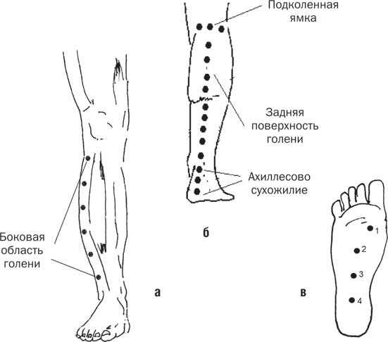 3. Затем надавливаем по 3 секунды на все приведенные точки задней поверхности голени, лодыжки и 4 точки подошвы ступней (рис. 8, б, в).