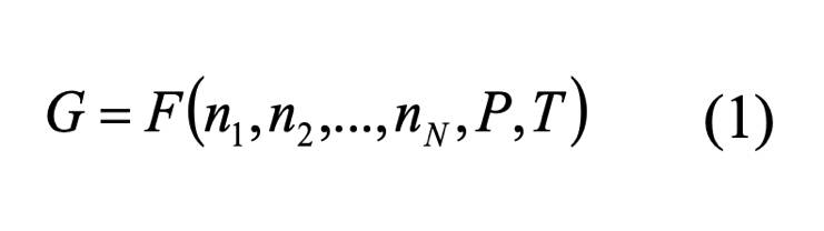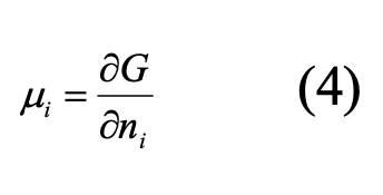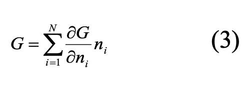 Общая энергия Гиббса системы складывается из энергий Гиббса всех веществ, которые в нее входят. Другими словами, она является функцией числа молей входящих в нее веществ, а также давления и температуры.