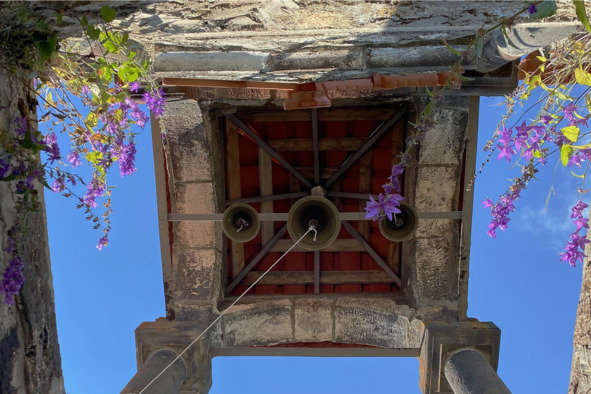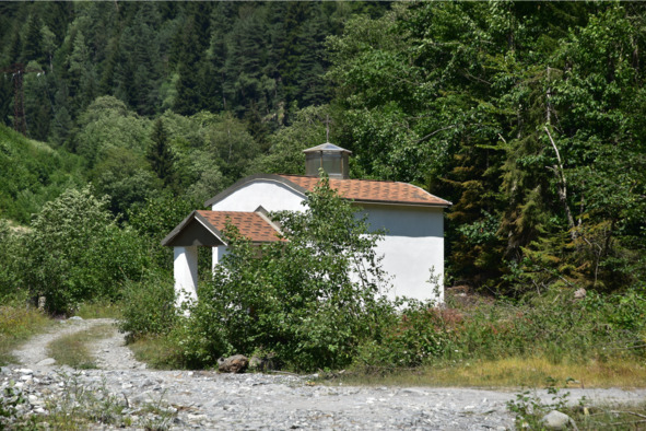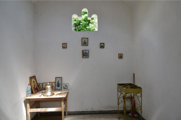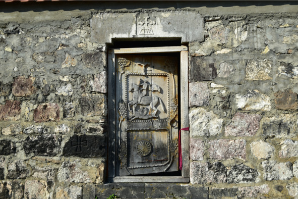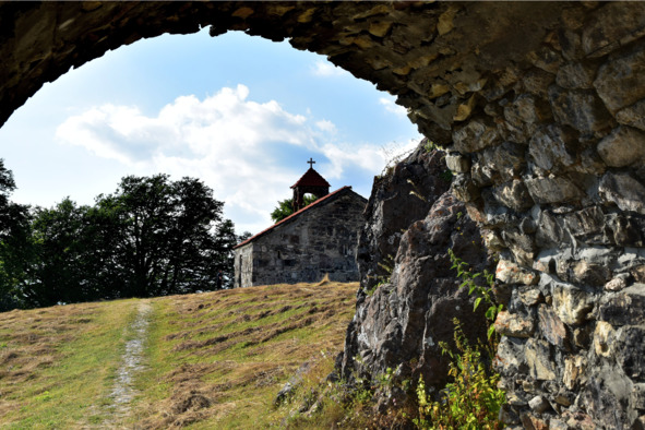 Действующая Згудерская часовня, согласно другим источникам – церковь Святого Георгия, заложенная то ли в XI веке, то ли позднее, но не позже XVII века, издали похожа на лишенный изысков обычный дом под двухскатной крышей, хотя и имеет красочную роспись потолка и стен, присущую итальянским храмам, со сценами Страшного суда и ликом лукавого. К расположенной подле смотровой площадке с видом на Цхинвал выводит добротная лестница, она же беговая дорожка для любителей утренней зарядки, несмотря на то что стена алтарной части храма уже упирается в начало погоста. Но если на это не обращать внимания и углубиться метров на двадцать вперед, а потом взять правее, лавируя в безмолвной тиши между оградами могил да уклоняясь от поникших в скорбном поклоне веток деревьев, то метров через тридцать покажутся руины второго храма. Это церковь Вознесения, по другим данным – Квирацховельская, от которой остался лишь выложенный из мелких валунов, разделенных рядами плоских кирпичей толщиной в два пальца, каркас стен с узкими прорезями окон и едва различимым кирпичным орнаментом в форме креста.