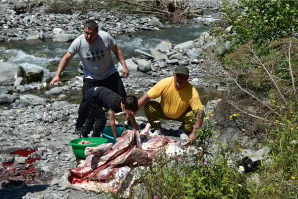 Но все это, включая предложение Сармата не посещать музей великого поэта и основоположника осетинской литературы Коста Левановича Хетагурова, ограничившись осмотром окрестностей с развалинами фамильных башен с высоты прилегающего к дороге холма, вначале казалось нам мелочью, не имеющей ничего общего с самим туром. Тем более что Сармат был очень любезен, бесконечно сыпал историями и рассказами о себе, семье и своих предках. К тому же сразу после прохождения границы он предоставил нам удивительную возможность насладиться горной земляникой в роскошной долине, устланной цветочным ковром, под шум скачущего по камням ручья, стрекот кузнечиков и жужжание пчел, оводов и прочей летающей мелюзги, а также прикоснуться к древним традициям, когда на берегу горной реки возле безымянной часовенки мы увидели мужчин, разделывающих тушу быка.