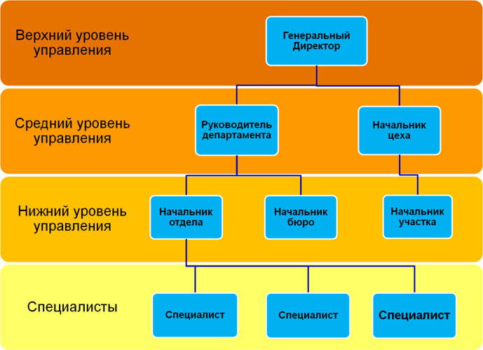 Теперь давайте поговорим о руководителях верхнего уровня управления. В большинстве случаев, руководитель верхнего уровня называется директор. Часто, в больших компаниях добавляют приставку «Генеральный». Встречается так же более пафосное название – «Президент». Когда рассматривают три уровня руководителей, говоря о верхнем уровне, подразумевается, что это начальники очень высокого ранга, и как правило, они руководят не просто руководителями, а руководителями среднего звена.