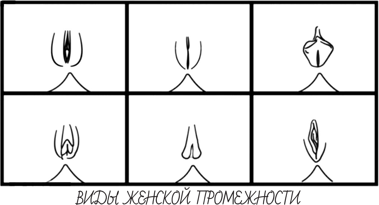 Малые половые губы спрятаны под большими губами, но не у всех. Существует очень много различных комбинаций того, как могут выглядеть малые и большие половые губы (см. рисунок выше), и все эти варианты являются нормой.