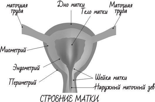 Часть шейки матки, которая является входом в этот орган, расположена в дне влагалища, которое плотно обхватывает ее со всех сторон. В центре матки имеется узкая щелевидная полость, по сути, сравнение с грушей тут опять будет уместным; полость матки, по сути, – это то место, в котором в груше находятся семечки, а мякоть груши – это и есть мышцы матки. Таким образом, матка – это самый «мышечный» орган в женском организме, это и очевидно, так как в родах необходимо с огромной силой выталкивать нового человека на свет. Мышцы матки относятся к непроизвольным мышцам, то есть своей волей вы их сокращать не можете, но эти мышцы, помимо полезных дел (родов), создают вам и проблемы: сильное и нередко неритмичное сокращение этих мышц во время менструации является причиной тех болей в животе, с которыми сталкивается практически каждая женщина.