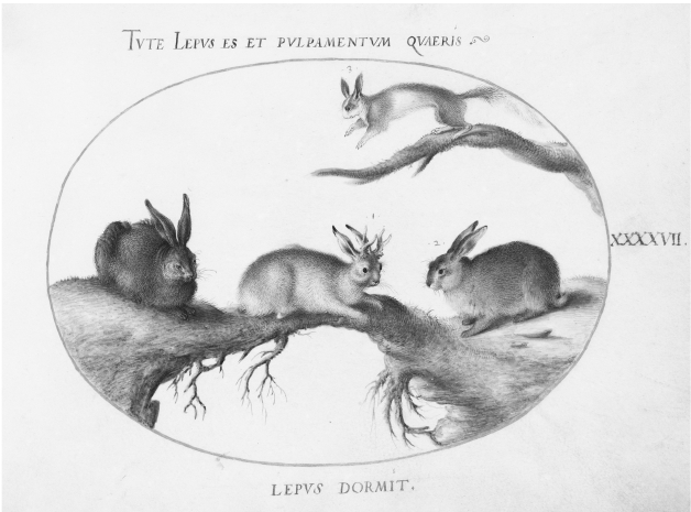ГРАВЮРА ЙОРИСА ХУФНАГЕЛЯ (ЧЕТВЕРОНОГИЕ РЕПТИЛИИ). ПОМИМО НОРМАЛЬНЫХ ЗАЙЦЕВ И БЕЛКИ В ЦЕНТРЕ ИЗОБРАЖЕН РОГАТЫЙ КРОЛИК. 1575 г.