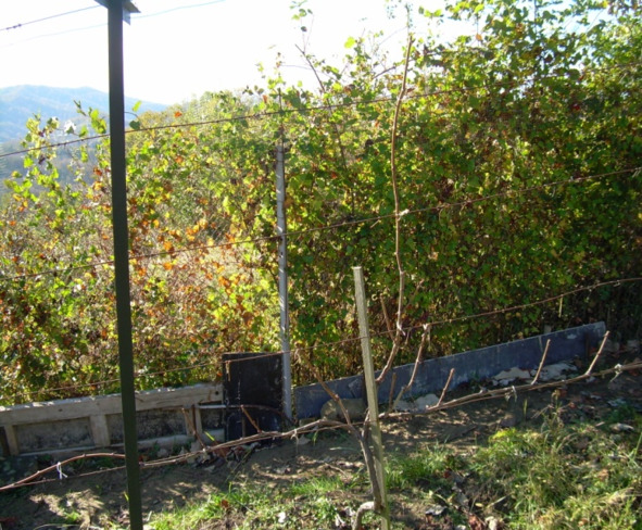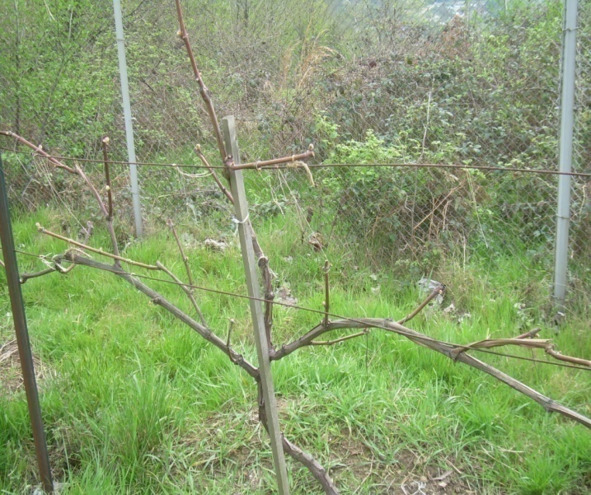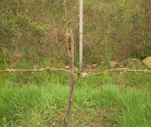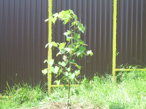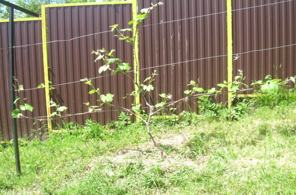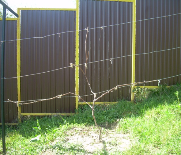 Для сортов со средними гроздями лучшей формировкой на данной шпалере считаю двухъярусный двусторонний кордон. На снимке вы видите зарождающееся начало такой формировки для куста третьей вегетации / на снимках один и тот же куст с интервалом в два месяца/.