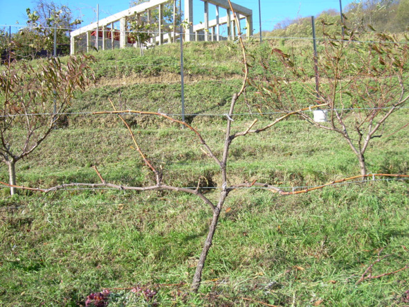 На снимках один и тот же куст НОА / клон/ в разные годы вегетации / 2011 и 2013/. На втором снимке показан куст после детальной весенней обломки побегов / май месяц/, и, тем не менее, урожай куста впечатляет / снимок №3, середина августа/, что для сорта, имеющего довольно высокий коэффициент плодоношения, является нормой. На этом снимке хорошо видно и распределение побегов на шпалере.