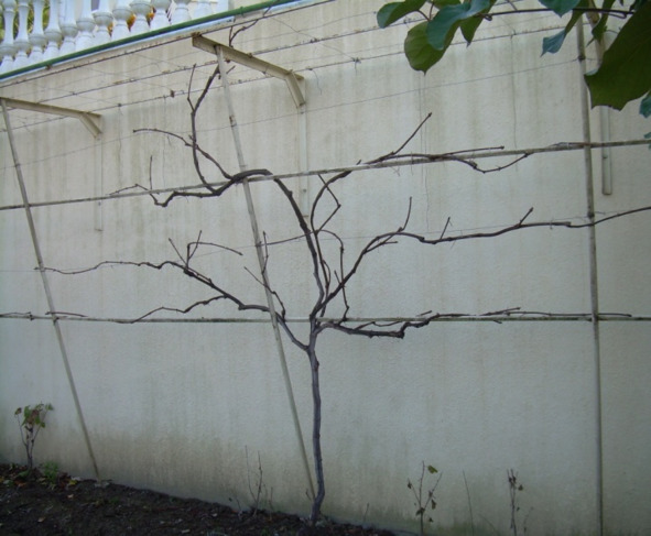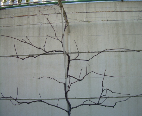 Примерная обрезка молодых виноградных кустов (со второй по четвёртую вегетации) при формировании их на многоярусной вертикальной шпалере в неукрывной зоне влажных субтропиков.