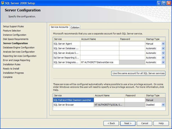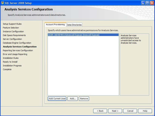 В выше представленном окне выберите смешанный режим подключения (Mixed Mode). Задайте пароль (Enter password) и его подтверждение (Confirm password). Добавьте нового администратора сервера, нажав кнопку «Add Current User» (Добавить текущего пользователя) и нажмите кнопку «Next». Появится окно для определения пользователя управляющего всеми службами сервера (Рис.0.13).