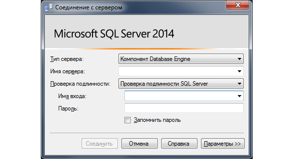 Замечание: Если при установке «Microsoft SQL Server» был задан логин и пароль подключения к серверу, то перед нажатием кнопки «Connect», в выпадающем списке «Authentication» нужно выбрать «SQL Server Authentication» (Проверка подлинности SQL Server), а затем необходимо ввести заданные при установке логин и пароль.
