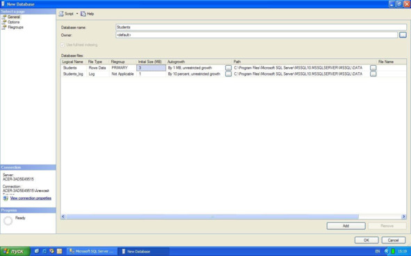 Замечание: Для добавления новых файлов данных или журналов транзакций используется кнопка «Add», а для удаления кнопка «Remove». В нашем случае мы оставим все основные настройки без изменений.