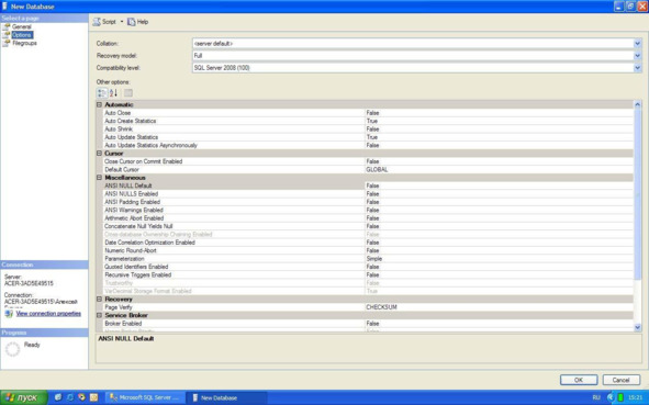 – Recovery Model – модель восстановления. Данный параметр отвечает за информацию, предназначенную для восстановления БД, хранящуюся в файле транзакций. Чем полнее модель восстановления, тем больше вероятность восстановления данных при сбое системы или ошибках пользователей, но и больше размер файла журнала транзакций. При наличии места на диске, рекомендуется оставить этот параметр в значении «Full».