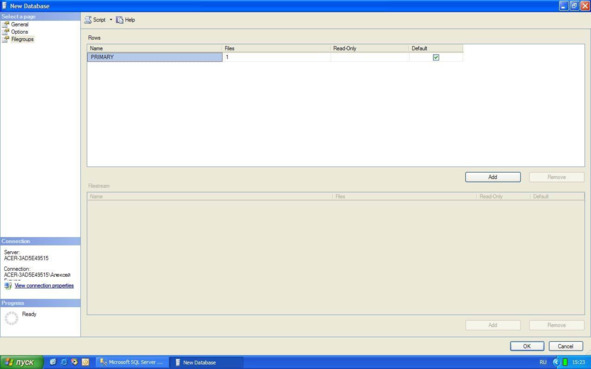 В рассматриваемой БД нет необходимости добавлять новые группы файлов. Поэтому оставим группу настроек «Filegroups» без изменений.