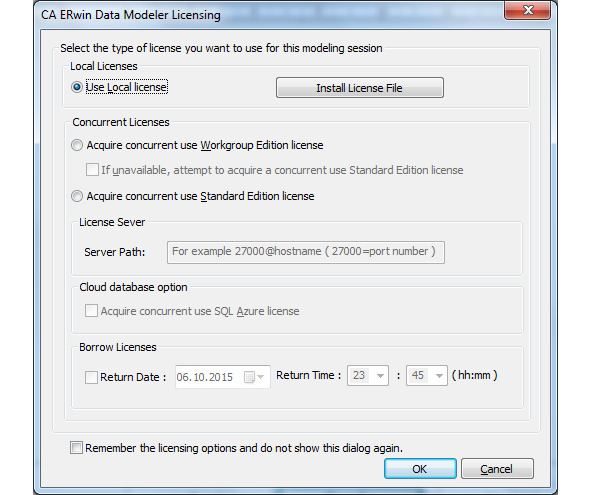 Установка СA Erwin Data Modeler не представляет из себя сложную задачу. Для этого достаточно запустить установочный файл с компакт-диска или скаченный с официального сайта CA ERwin и следовать стандартным инструкциям мастера установки (рис. 0.26—0.30). При первом запуске программы необходимо указать имеющуюся лицензию (рис. 0.30—0.32). Лицензию можно приобрести или использовать условно бесплатную с ограничением на количество сущностей в проекте (не более 25).