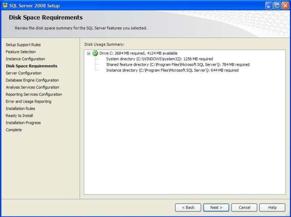 Задайте вышеописанные параметры и нажмите кнопку «Next». Появится окно с отчётом о количестве свободного места на диске, куда устанавливается экземпляр сервера (Рис. 0.9)