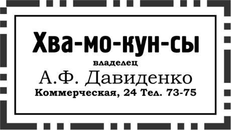 Может быть, «Хва-мо-кун-сы» – это в переводе как раз и есть «покрышки и авточасти»? Или это название компании Афанасия Фёдоровича – юридического лица, которое и открыло магазин? Да не где-нибудь на отшибе, а в самом центре Пристани, на Коммерческой, 24.