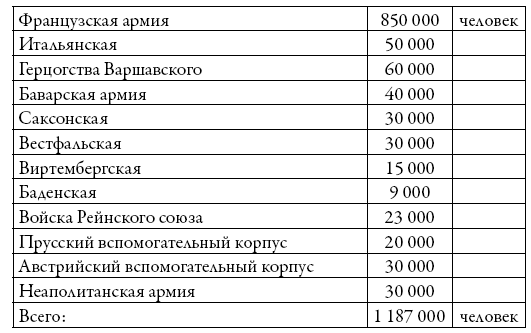 Кроме вышеупомянутой многочисленной армии Наполеон располагал еще всеми силами Королевства Италийского, Герцогства Варшавского, государей Рейнского союза и короля Неаполитанского.