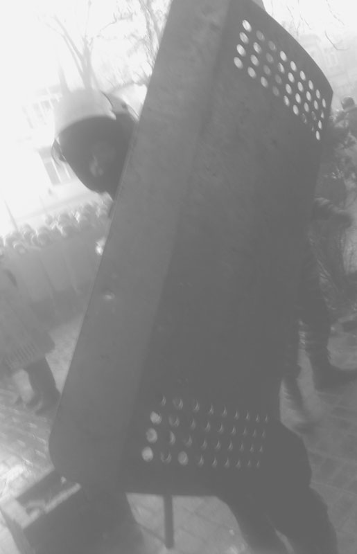 Толпа понемногу разогревалась. Сначала старички с казацкими усами стали хватать за броники и умоляли пропустить их в Кабмин, хотя и сами не знали, зачем им туда нужно, при этом елейным голосом спрашивали: «Вы с народом, сыночки?». Немного позже к дедушкам присоединились «спортики» и навалились дружной толпой, пробуя потеснить шеренги милиции назад. А в это время из-за спин боевиков, которые толкались с милицией, дедушки били по шлемам удочками, на которых висели чёрно-красные флаги и флаги «Свободы», при этом норовя попасть в лицо и выколоть глаз. Пользуясь суматохой, в лицо «Беркутам» из толпы стали брызгать слезоточивым газом.