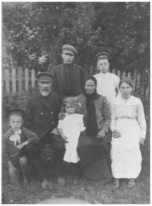 Тузовы и Урновы (слева направо) сидят Петр Алексеевич Тузов и Ефим Васильевич Урнов, стоят молодые Тузовы, впереди у них – раскулачивание.