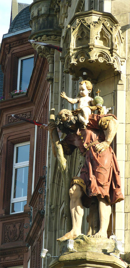 Поезд, отправляющийся в 8–37, мы решили пропустить, чтобы не бежать на вокзал. Спокойно прогулялись к Porta Nigra, полюбовались ими при утреннем свете, потом обратили внимание на красивые здания восточнее ворот. Больше всего мне понравился неоготический дом Zum Christophel, построенный в 1895–1897 годах. Его угол на втором этаже украшает изваяние святого Христофора с младенцем Иисусом на спине.