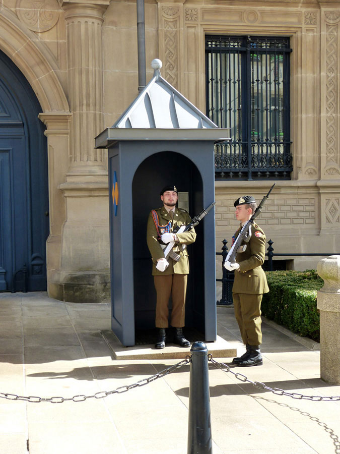 Мы пришли как раз вовремя. Перед дворцом начался развод караула. Один караульный в форме цвета хаки и с чёрным беретом на голове стоял в будке, крепко сжимая универсальную винтовку Steyr AUG A1 с примкнутым штык-ножом. Второй, обмундированный так же, печатал шаг по плитке возле дворца. Потом они поменялись. Из украшений на форме солдат могу отметить лишь аксельбанты, сплетённые из голубого и оранжевого шнуров, на левых плечах караульных.
