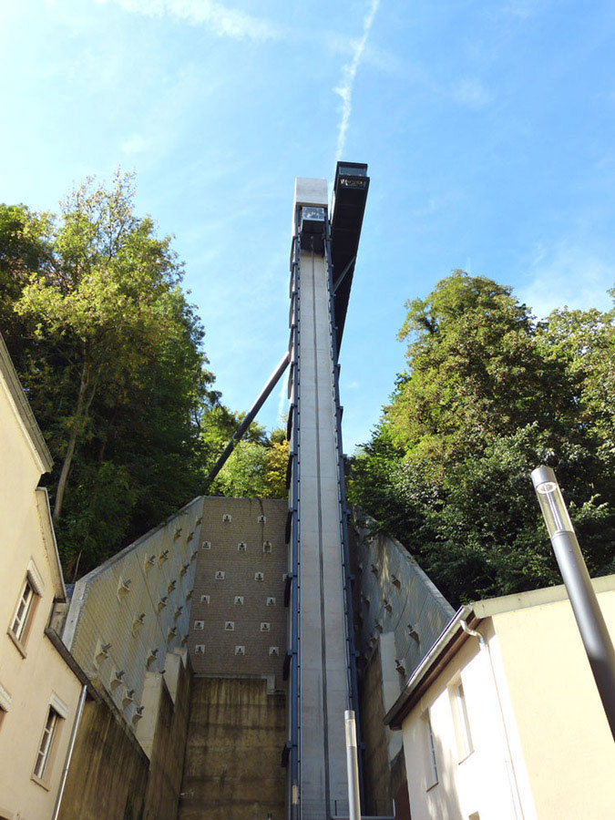 От дома престарелых мы прошли через муниципальный парк к лифту. Lift Pafendall-Uewerstad был открыт 22 июля 2016 года. Чтобы попасть к нему, нужно сначала пройти по пешеходной галерее со стеклянными стенами над обрывом. Галерея заканчивается смотровой площадкой с прозрачным полом и круговым обзором. Отсюда открывается шикарный вид на долину реки Альзет и на старинный квартал Pfaffenthal. Севернее, на высоте 74 метра над рекой, пролегает красный мост Великой герцогини Шарлотты, открытый в 1966 году.